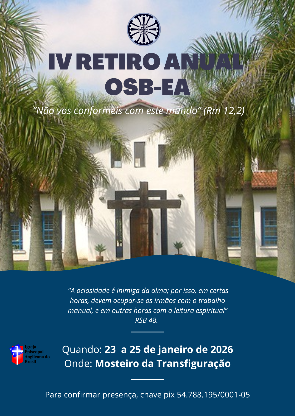 Estamos nos apropximando de nosso Retiro Anual da Ordem. Nos dias 23 a 25 de janeiro, os irmãos Oblatos, postulantes e noviços estarão no Mosteiro da Transfiguração em Mogi das Cruzes-SP para celebrar e viver a vida de oração. Peçamos a Deus que este seja um momento de renovação dos votos de cada um de nós e de nosso compromisso com nosso carisma. Que São Bento e Sta. Escolástica nos ajude!